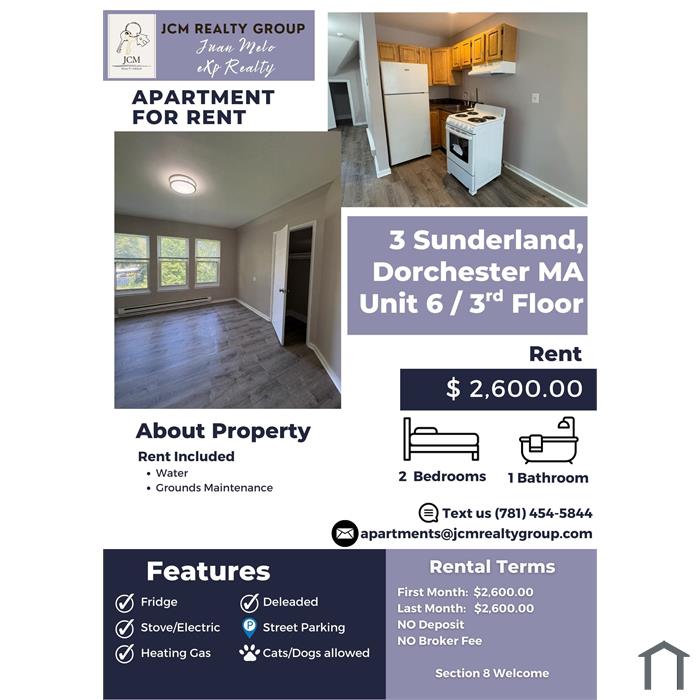 Rental Terms: First Month's Rent: $2,600.00, Last Month's Rent: $2,600.00, No Security Deposit, No Broker Fee. Section 8 Welcome. Included in Rent: Water, Grounds maintenance. Features: Fridge, Stove/Electric, Heating Gas, Deleaded, Street Parking, Cats/Dogs allowed.