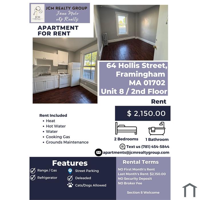 Rental Terms: First Month's Rent: $2,150.00, Last Month's Rent: $2,150.00, No Security Deposit, No Broker Fee. Rent Included: Heat, Hot Water, Water, Cooking Gas, Grounds Maintenance. Features: Street Parking, Deleaded, Cats/Dogs Allowed, Range / Gas, Refrigerator.