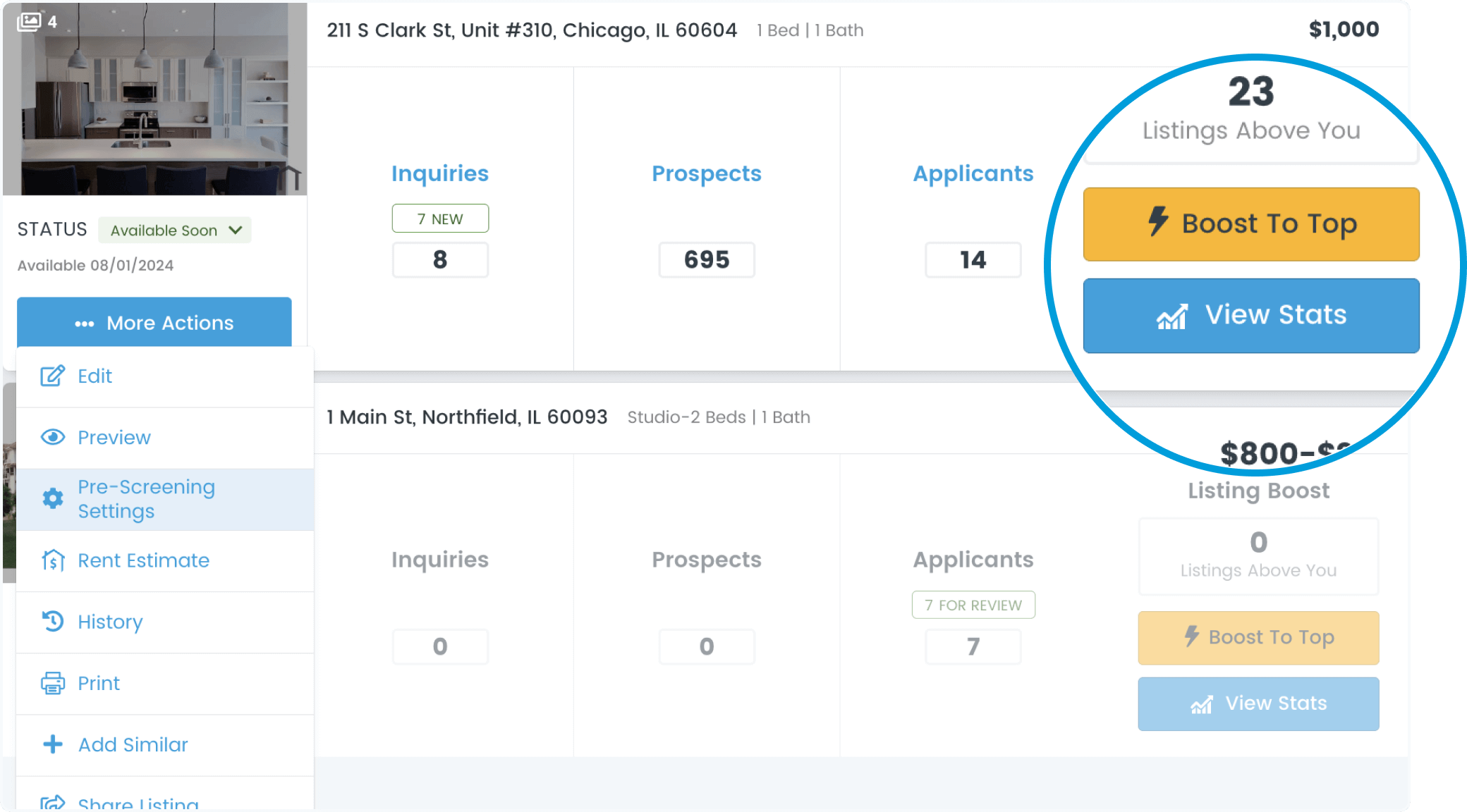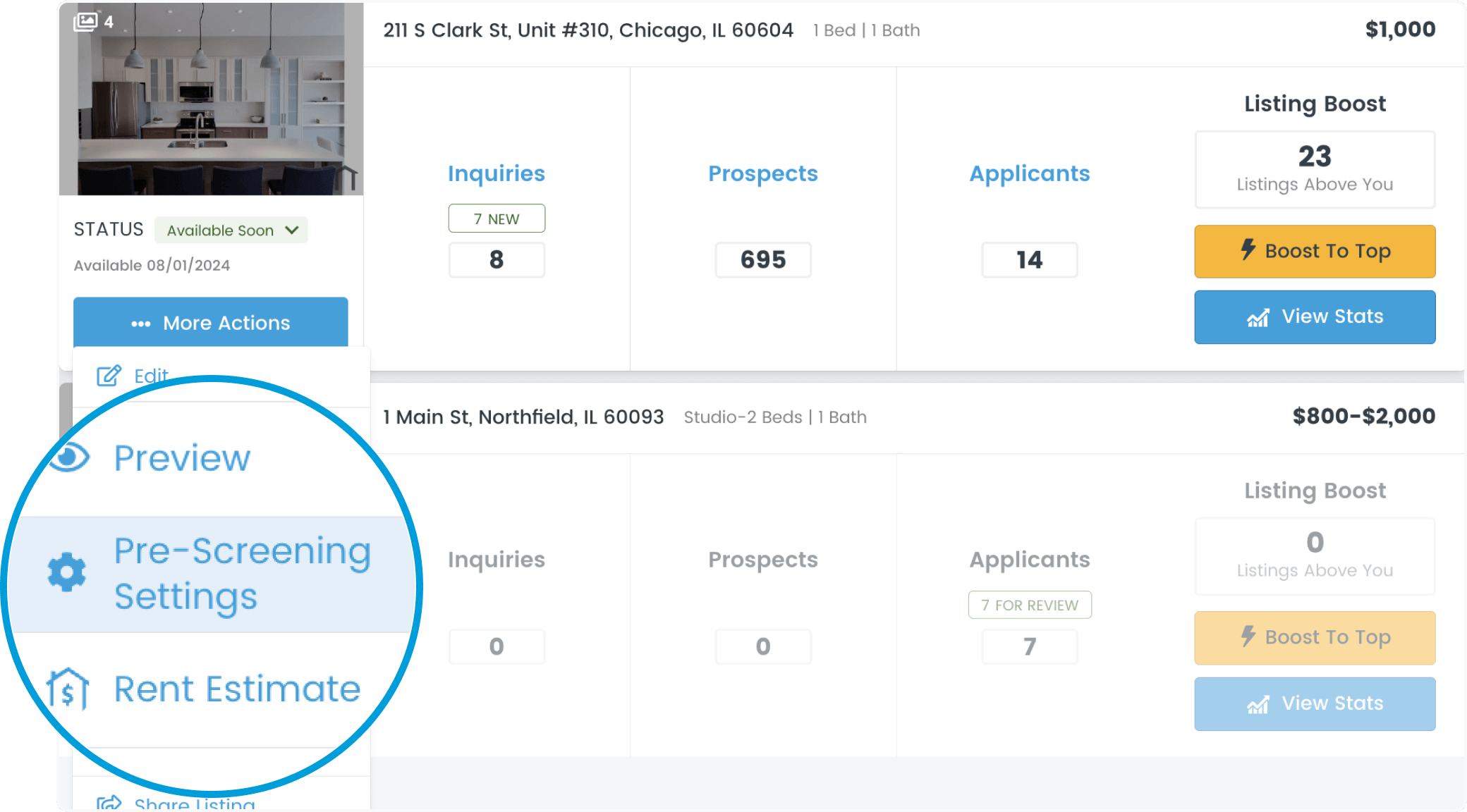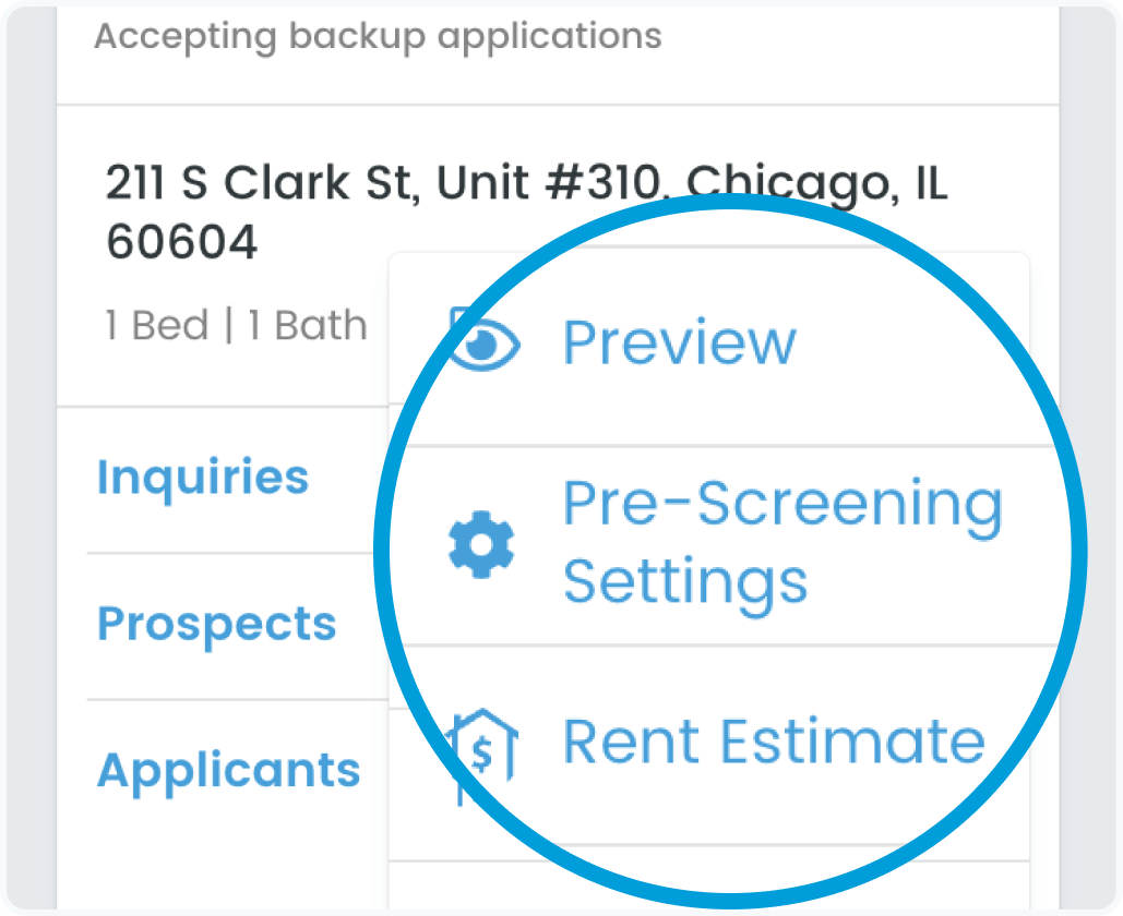 Control how renters apply to your property by using the pre-screening settings found in the dropdown menu of each available property listing.
