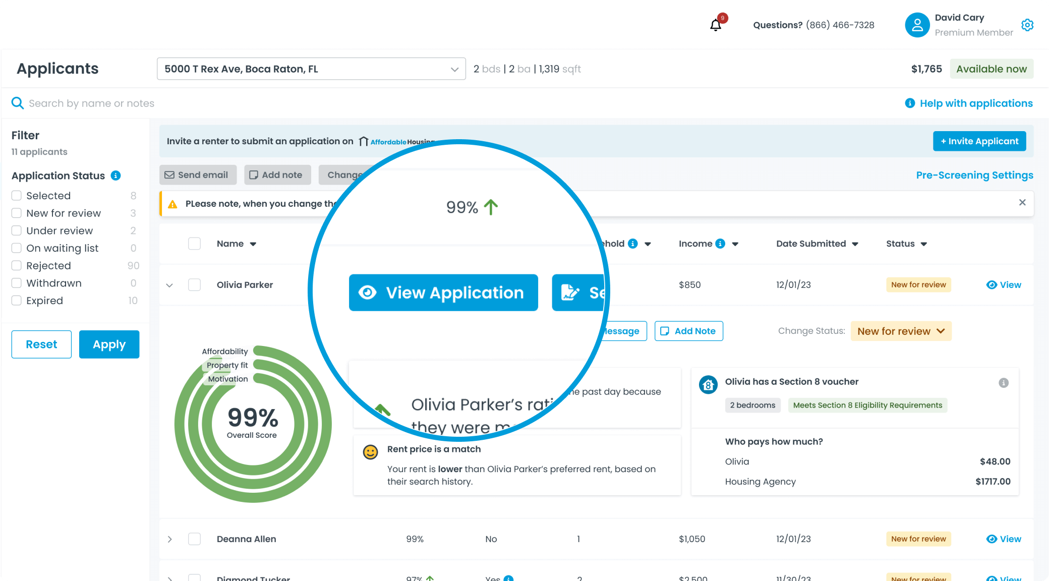 With Premium, instantly see renter scores generated by our advanced algorithm, showing each applicant's fit for your property.